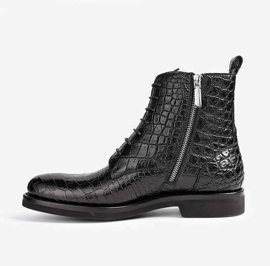 Handmade Black Crocodile Leather High Ankle Side Zipper Dress Lace Up Boots