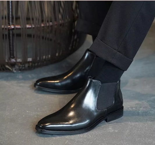 Handmade Black Men Chelsea Leather Ankle Pull On Dress Boot, Formal Boot