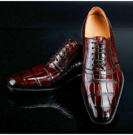 Elegant Men Maroon Lace Up Crocodile Texture Leather Almond Toe Shoes