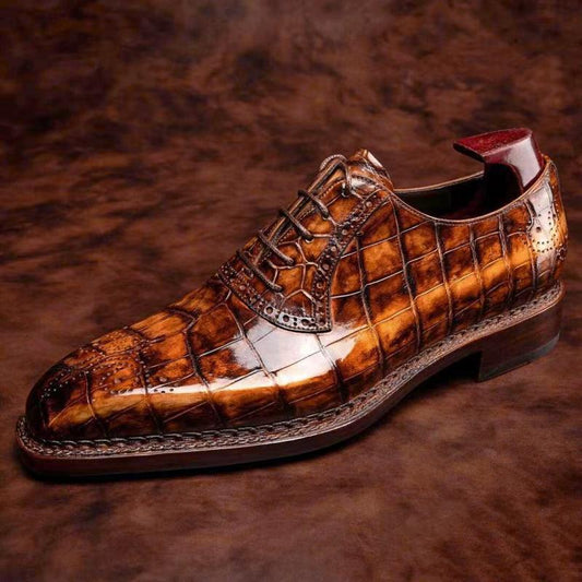Handmade Men Shaded Tan Brown Crocodile Leather Lace Up Dress Shoes, Office Shoe