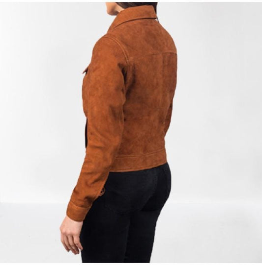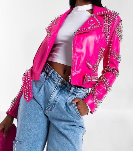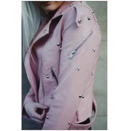 Pink Color Women Genuine Leather Jacket Silver Star Studs