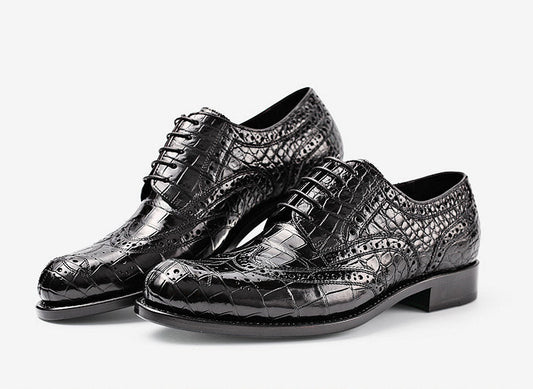 Handmade Black Wing Tip Crocodile Leather Derby Laces Dress Shoes, Business Shoe