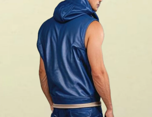 Handmade Blue Sleeveless Jacket, Blue Leather Biker Hood Jacket, Fashion Jackets